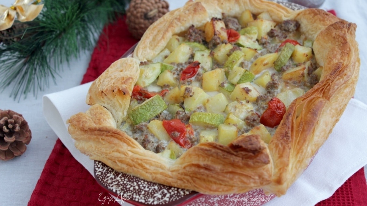 Если у вас небольшая компания, то можно в качестве закуски на праздничный стол, приготовить этот сочный пирог с говяжим фаршем и овощами на основе слоеного теста.