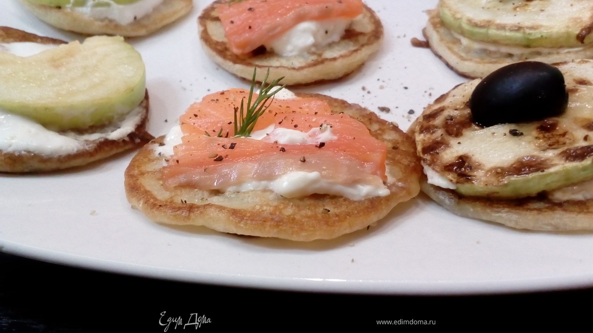 Такие оладьи можно подавать не только со сметанным кремом, но и использовать как основу для фуршетных закусок канапе. Получится сытно и вкусно.