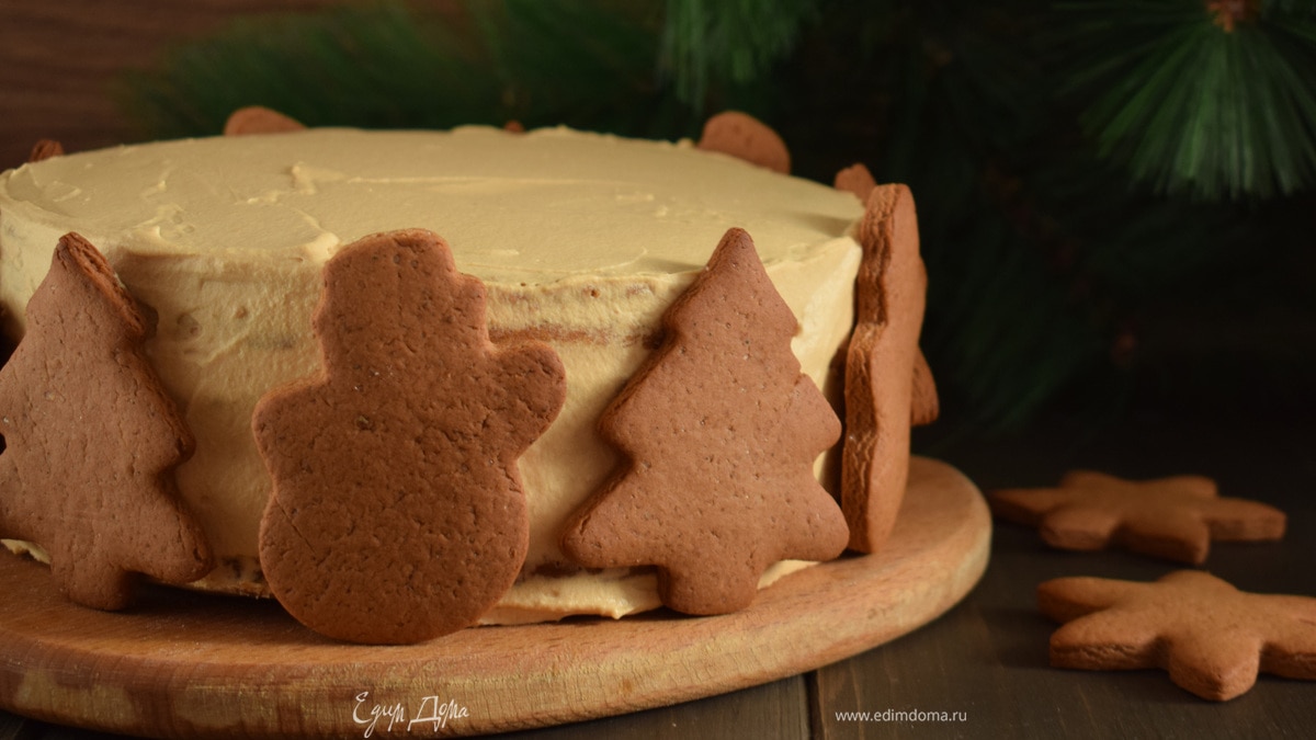 Чудный имбирный торт с кремом из соленой карамели и декором из имбирных пряников. Просто сказка!