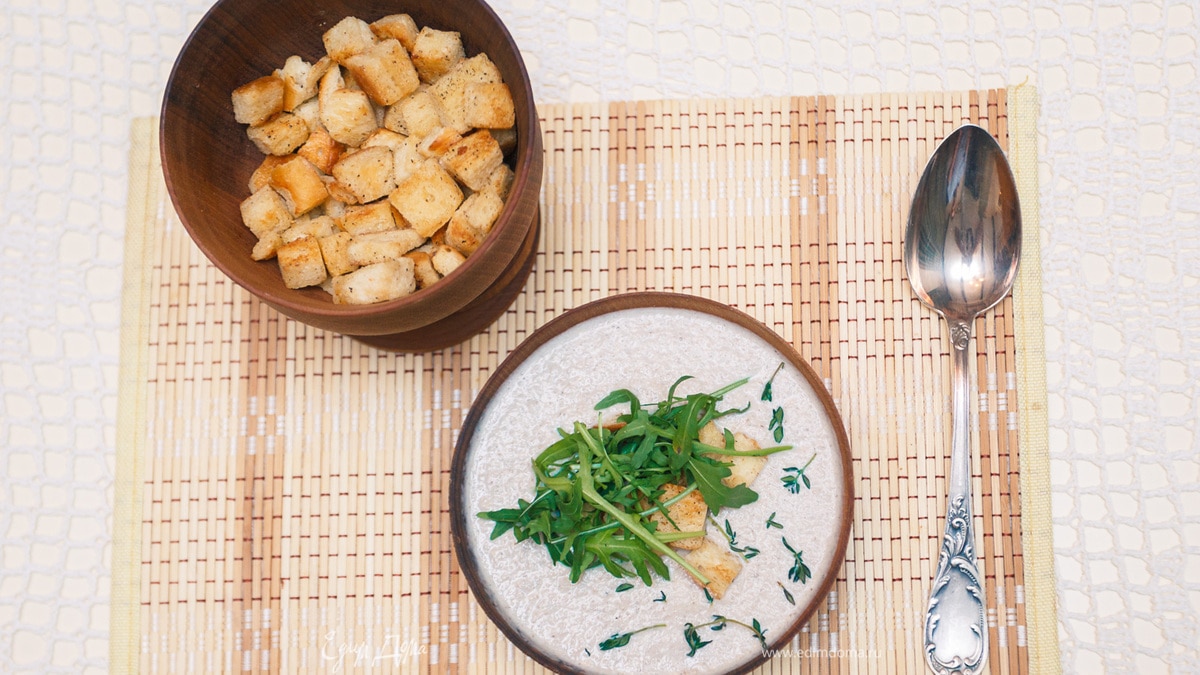 Наливаем суп в тарелку. Украшаем сухариками и небольшой горсточкой руколы, 20 минут и суп готов!!!!! Приятного аппетита!