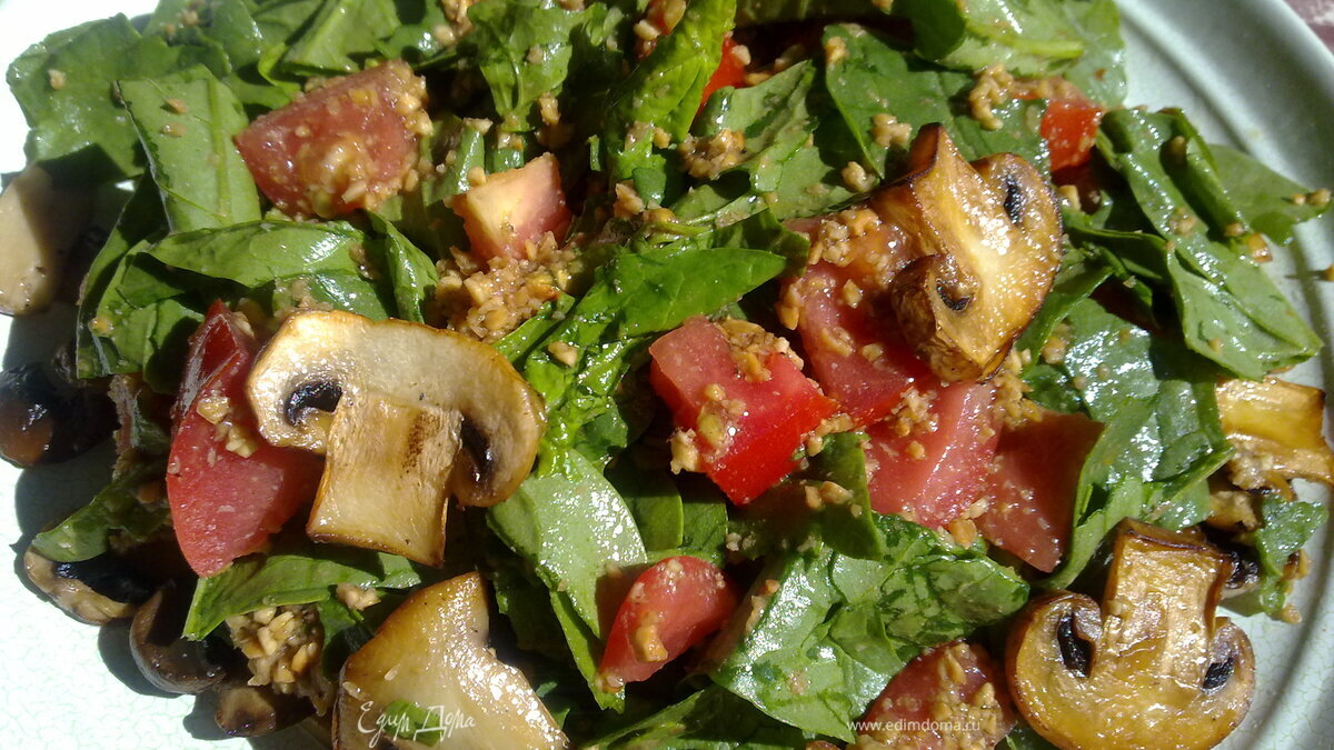 - Шаг 11.Шпинат промыть, высушить, оборвать стебли. 2.Приготовить заправку: на сковороде обжарить миндаль до румяности, выложить их в блендер, добавит оливковое масло, бальзамик, и перемолоть в течении 10 сек (орехи не должны быть в пыль), посолить, поперчить. 3.В отдельной миске перемешать листья шпината, порезанные пополам помидорки черри и заправку. 4.Шампиньоны порезать так, чтобы сохранился «профиль», и обжарить на сильно разогретой сковороде, чуть смазанной оливковым маслом, минут 5, посолить и поперчить. Выложить их на дно тарелки и сверху выкладываем салат.