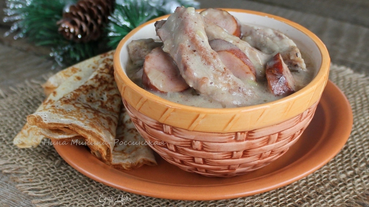 В нашем семейном меню пряженина традиционно готовится в новогодние праздники или на Рождество. Это блюдо русской кухни готовится из свиных ребрышек и колбасы, которые сначала обжаривают (пряжат), а затем томят в мучном соусе.
