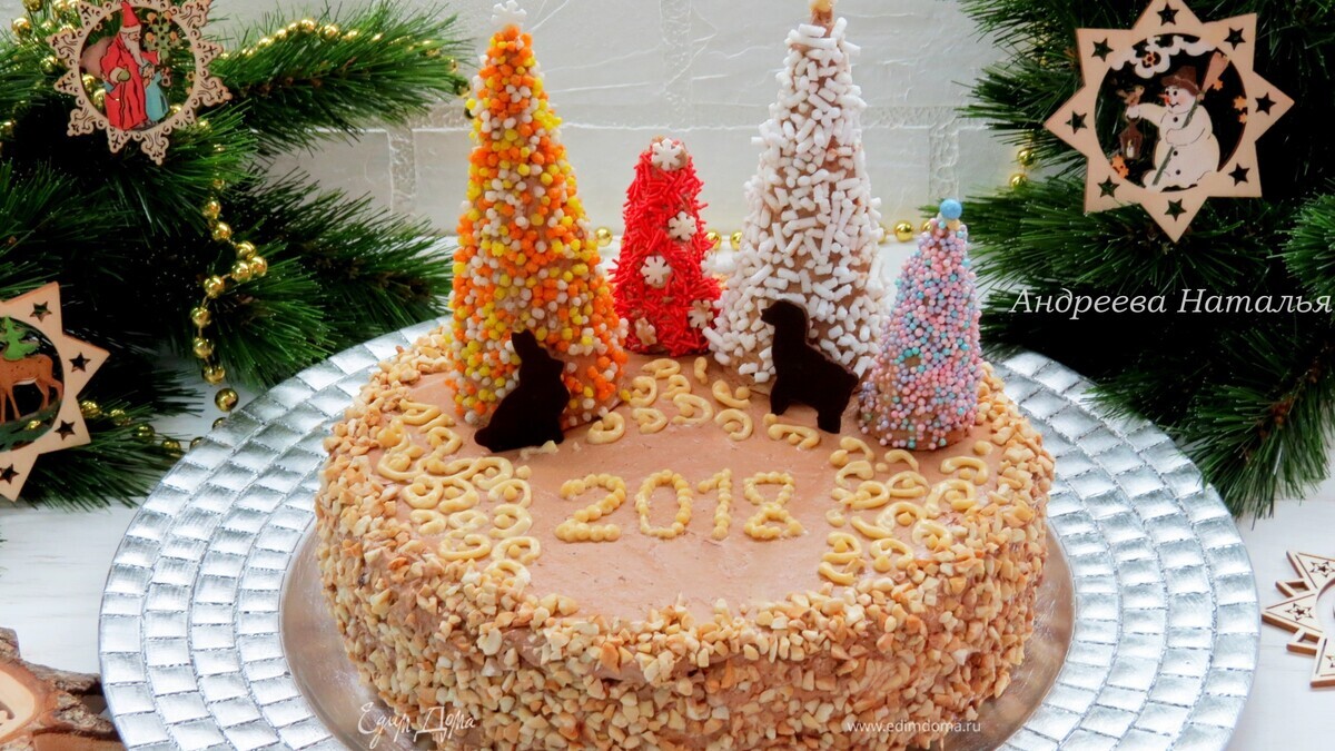 Верх и бока торта обмазываем шоколадным грильяжным кремом. Бока украшаем дроблеными орехами. Я решила украсить торт в новогоднем стиле. Для елочек обмазала вафельные рожки шоколадным кремом «Шарлотт» и обсыпала кондитерской посыпкой. С помощью вырубок для печенья сделала шоколадные силуэты зверюшек. - Шаг 23