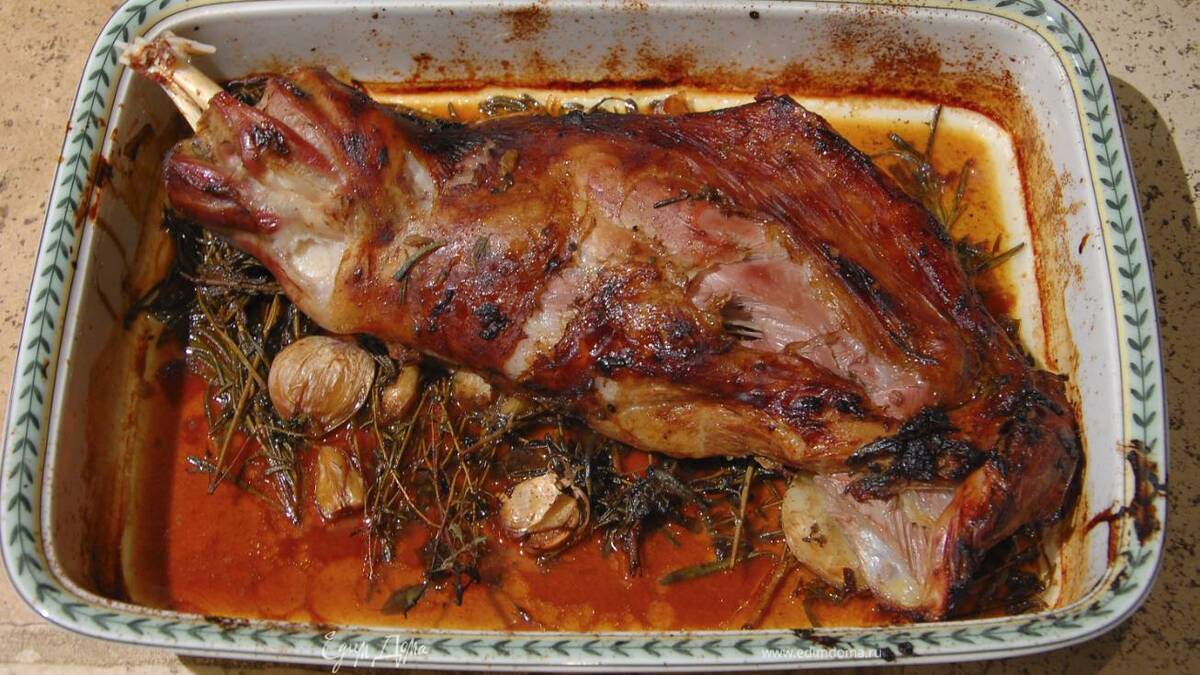 Запекать баранину в разогретой духовке около часа, периодически поливая образовавшимся соусом, затем понизить температуру в духовке до 160°С, затянуть форму фольгой и запекать мясо до готовности, продолжая поливать его соусом. Если жидкость выпарилась, влить немного бульона, вина или горячей воды.