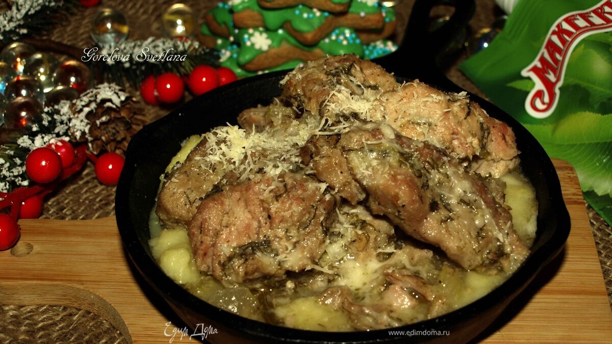 Подавать телятину можно в одном большом блюде. Можно подать порционно. В небольшие формочки для запекания выкладываем куски телятины и посыпаем тертым пармезаном, отправляем в горячую духовку, пока сыр слегка не расплавится. Я подавала на подушке из картофельного пюре. - Шаг 6