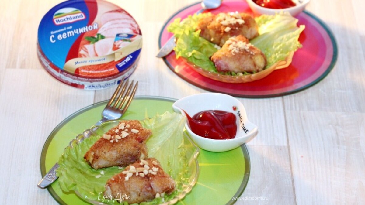 Обваливаем сыр Hochland в измельченных орехах.