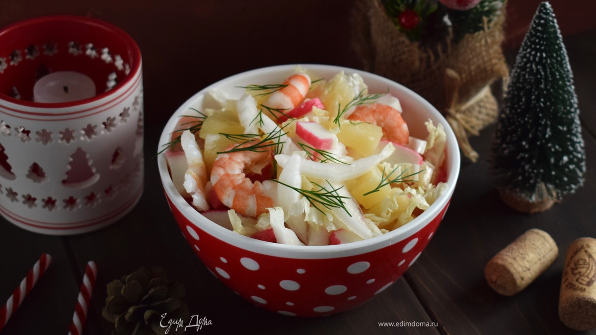 Если креветки крупные — разрезать вдоль (удалить при необходимости кишечную вену). Добавить в салатник. Приправить по вкусу солью и перцем.