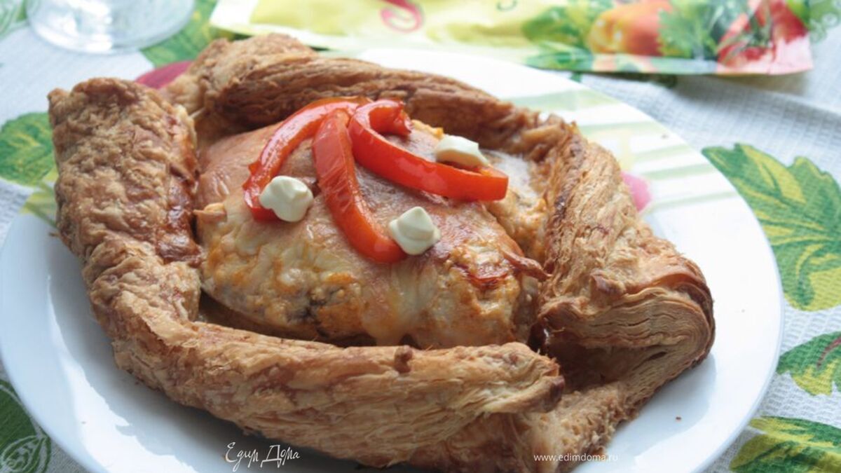 Смажьте «лодочку» из теста яичным желтком и отправьте ее запекаться в духовку на 20-25 минут при 180°С (без конвекции). Если куриная грудка попалась толстоватая и есть вероятность того, что можно убрать температуру до 150°С, накрыть «лодочку» фольгой и довести до готовности. - Шаг 6