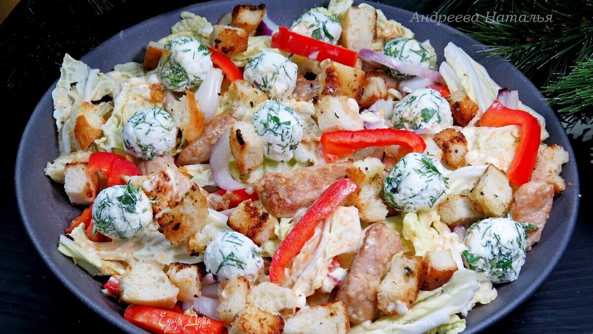 Когда я увидела рецепт этого салата, он прямо запал мне в душу. В этом салате есть все, что я люблю: сочные листья пекинской капусты, сладкий перчик, хрустящий салатный лук, ароматная сочная курочка, пряные сухарики и пикантные творожные шарики с зеленью. Все вышеперечисленные ингредиенты идеально оттеняет и дополняет вкуснейшая заправка на основе сока мандарина! Этот салат исчез с праздничного стола первым, и муж заказал его на Рождество и на свой День Рождения, который будет через неделю :)