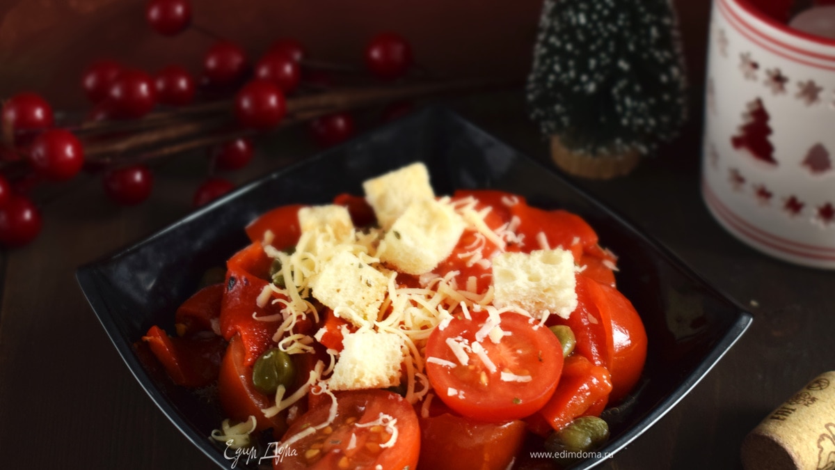 Тон салата задают запеченные с пряностями сухарики, семена фенхеля просто преображают вкус хлеба. А если добавить сочные спелые помидоры и маринованные перцы, то оторваться от салата просто невозможно.