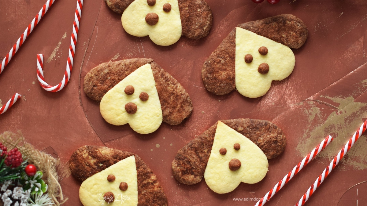 Противень застелить пергаментной бумагой или тефлоновым листом для выпечки. Выложить на противень перевернутое светлое сердечко, а из половинок тёмного выложить по бокам ушки. Из остатков шоколадного теста скатать маленькие шарики и выложить их на светлое тесто в форме глаз и носа собачки. Выпекать 10-15 минут в середине разогретой до 180°С духовки. - Шаг 8