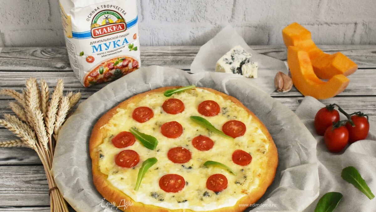 Тесто с пюре из тыквы — это мое недавнее открытие. Оно мягкое и податливое, чудесно раскатывается, а тыква, кроме как цветом, совсем не выдает себя. Но какое же оно потрясающе вкусное, какая текстура! Да и начинка в этот раз гениальна — творожный соус и три моих любимых сыра (пармезан, горгонзола и моцарелла). Количество продуктов в рецепте рассчитано на 2 пиццы диаметром 26–28 см.