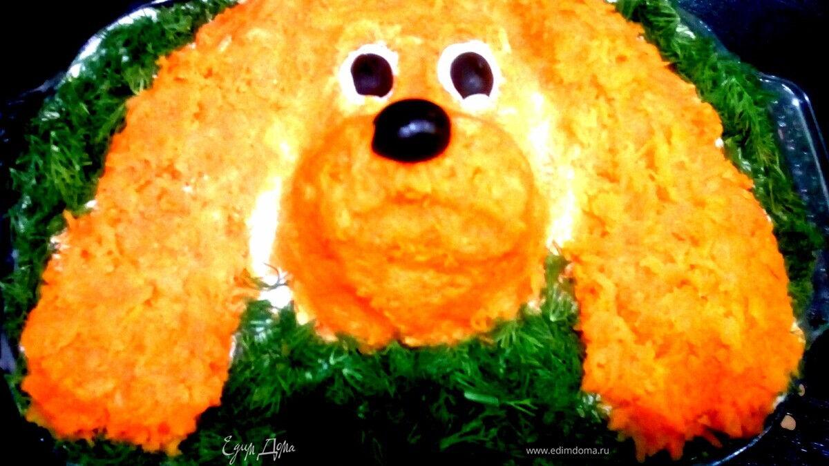 - Шаг 5Хочу отметить, что отварная морковь легко принимает любую форму и отлично ее держит. Первым делом выкладываем голову нашей собачки, делаем мордочку и ушки.