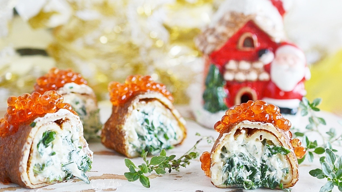 Блины — самое настоящее русское блюдо, которое издавна готовили на все праздники! И с чем только их не подавали! А если нафаршировать блины рыбным салатом, нарезать на рулеты и украсить икрой — получится настоящая Новогодняя закуска! Она с успехом заменит и тяжелые майонезные салаты и бутерброды с икрой! Оригинальная и вкусная, которая стильно смотрится на столе. Для начинки обязательно используем качественную рыбную продукцию ТМ «Магуро»!