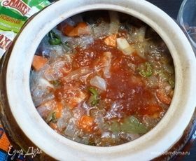 Заливку приготовим, размешав в небольшом количестве воды кетчуп и хрен ТМ «МахеевЪ». Содержимое горшка должно быть едва-едва покрыто заливкой. Ставим горшок в духовку, включаем ее на 180°С и оставляем томиться на 3 часа.