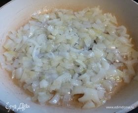 Репчатый лук нарежем и обжарим. Пока лук жарится, нарежем остальные овощи.