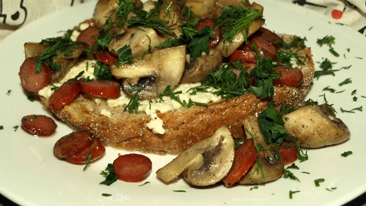 На хлеб выкладываем омлет, сверху грибы с охотничьими колбасками, посыпаем рубленой зеленью. - Шаг 7