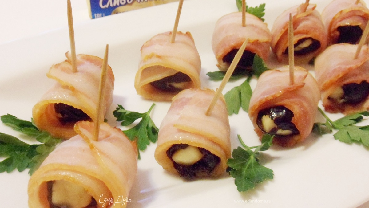 Фаршированный сыром чернослив в беконе готов. Приятного аппетита! Угощайтесь!