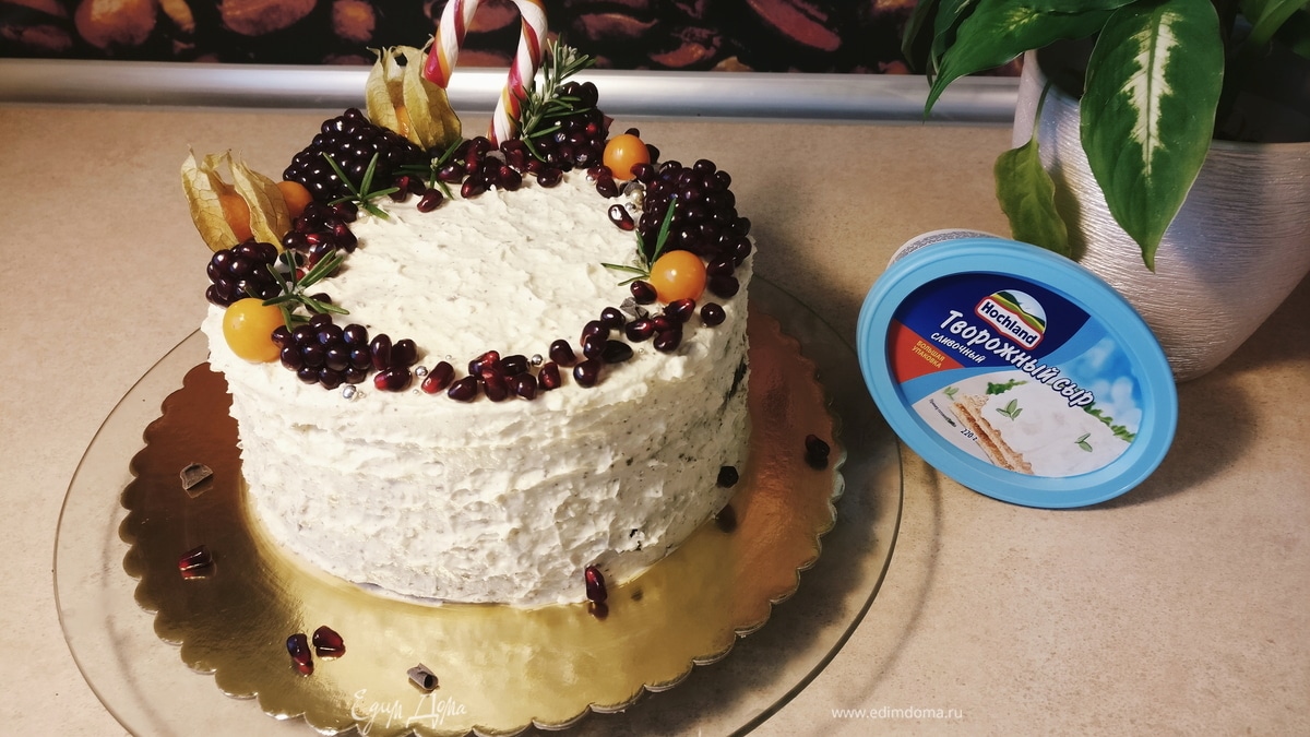 Теперь добавляем творожный сыр и сахарную пудру. И взбиваем окончательно. Творожный сыр Hochland будет чуть солоноватый, соль усиливает сладкие ингредиенты и чуть оттеняет их (чтобы крем не стал приторным). Крем получается достаточно устойчивым, им можно покрывать бока и верх торта, крем не «ползет» и сохраняет форму. - Шаг 9