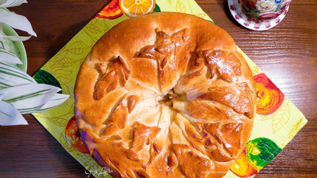 - Шаг 3Формовка. Разделить тесто пополам. Смазать форму для выпекания растительным маслом. Раскатать первый пласт теста в круг, перенести в форму и сформировать бортики. Выложить начинку по кругу, оставив центр свободным. Раскатать второй пласт теста в круг, вырезать из середины круг, пласт переносим в форму. Смазать края пирога взбитым яйцом и соединить половинки теста между собой. Смазать весь пирог яйцом. Центр теста разрезаем ножом для пиццы и натягиваем кусочки на внешнюю сторону. Выпекать при температуре 190°С 20-25 минут.