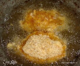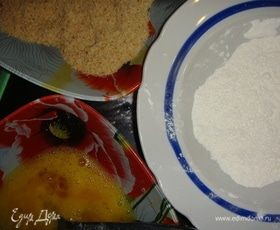 Взять три глубоких тарелки, в одной взбить яйца с солью, в другую высыпать панировочные сухари, в третью всыпать муку с солью. Берем котлету, обваливаем ее в муке, потом в яйцах, затем — в панировочных сухарях и снова в муке, в яйцах, в панировочных сухарях.