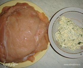 Куриное филе помыть, обсушить бумажными полотенцами. Филе разрезать вдоль. Накрыть пищевой пленкой и слегка отбить. Сливочное масло комнатной температуры размять вилкой и смешать с мелко нарубленным укропом.