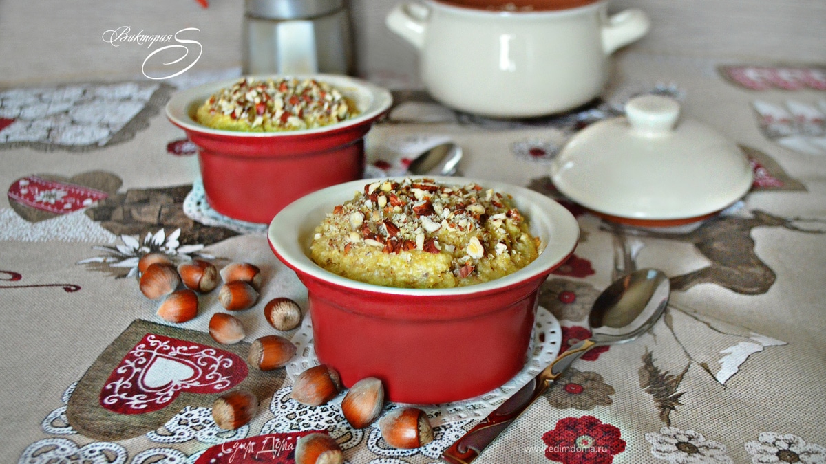 Керамические формы для запекания смажьте сливочным маслом, выложите подготовленную пшенную смесь, посыпьте фундуком и запекайте в разогретой до 180°С духовке 30–35 мин. - Шаг 5
