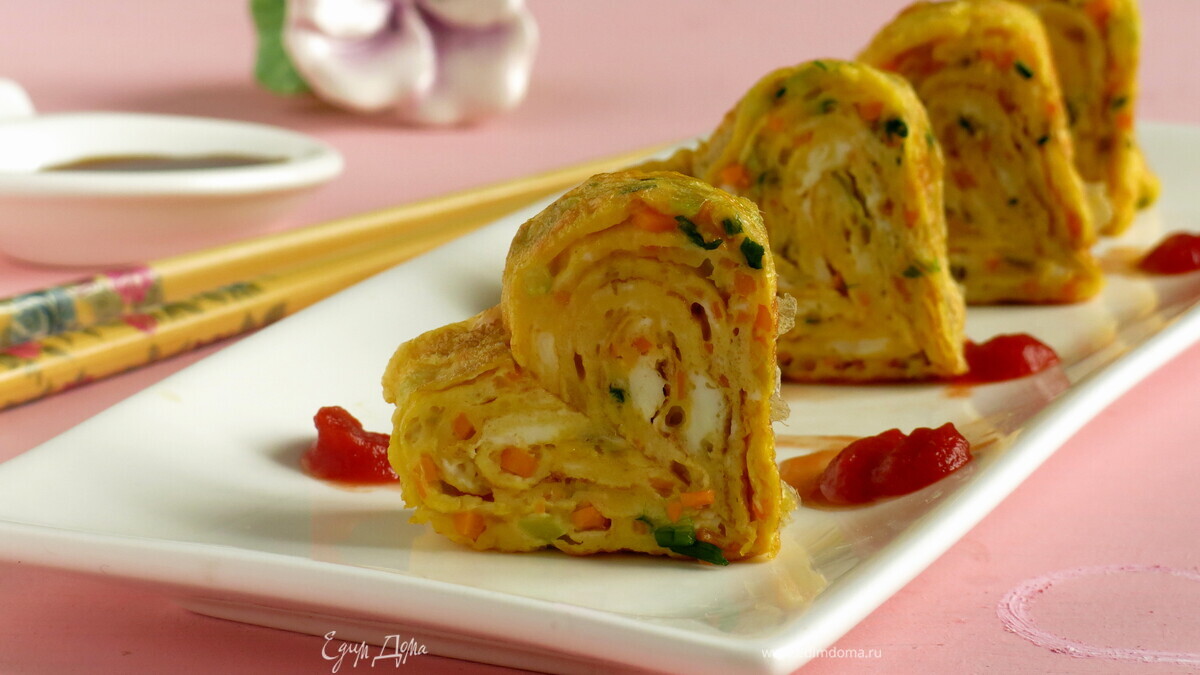 Наливаем омлет 1/4 часть от общего объема на смазанную маслом сковородку, прожариваем, сворачиваем роллом, еще 2–3 раза доливаем и сворачиваем. На этом этапе важно не порвать омлет, аккуратно свернуть, с гибкой лопаткой это легко получится, и вы не обожжете пальцы. Пару ложек яичной массы не используем. - Шаг 7
