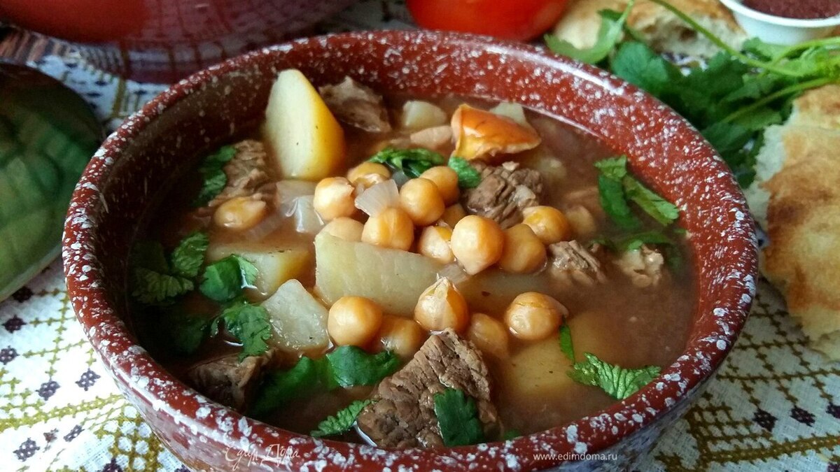 На улице мороз, зима не спешит сдавать позиции, и на обед все еще хочется согревающего супчика. Предлагаю приготовить азербайджанский суп Пити, популярное национальное блюдо. Основные компоненты супа — это баранина, нут, каштаны, алыча, чернослив либо айва. Но каштаны часто заменяют картофелем, алычу, при ее отсутствии, черносливом либо айвой. Что касаемо специй, то их наличие в супе минимально, в части разнообразия. Добавляют мяту, шафран (для придания цвета супу), но одна пряность неизменна — это сумах (она обладает кисловатым вкусом и придает блюду рубиновый отттенок). Суп несколько часов томится в духовке, в горшочке. Получается в результате сытное, ароматное, вкусное блюдо. Мы не любим баранину, поэтому я заменила мясо баранины говяжьим.