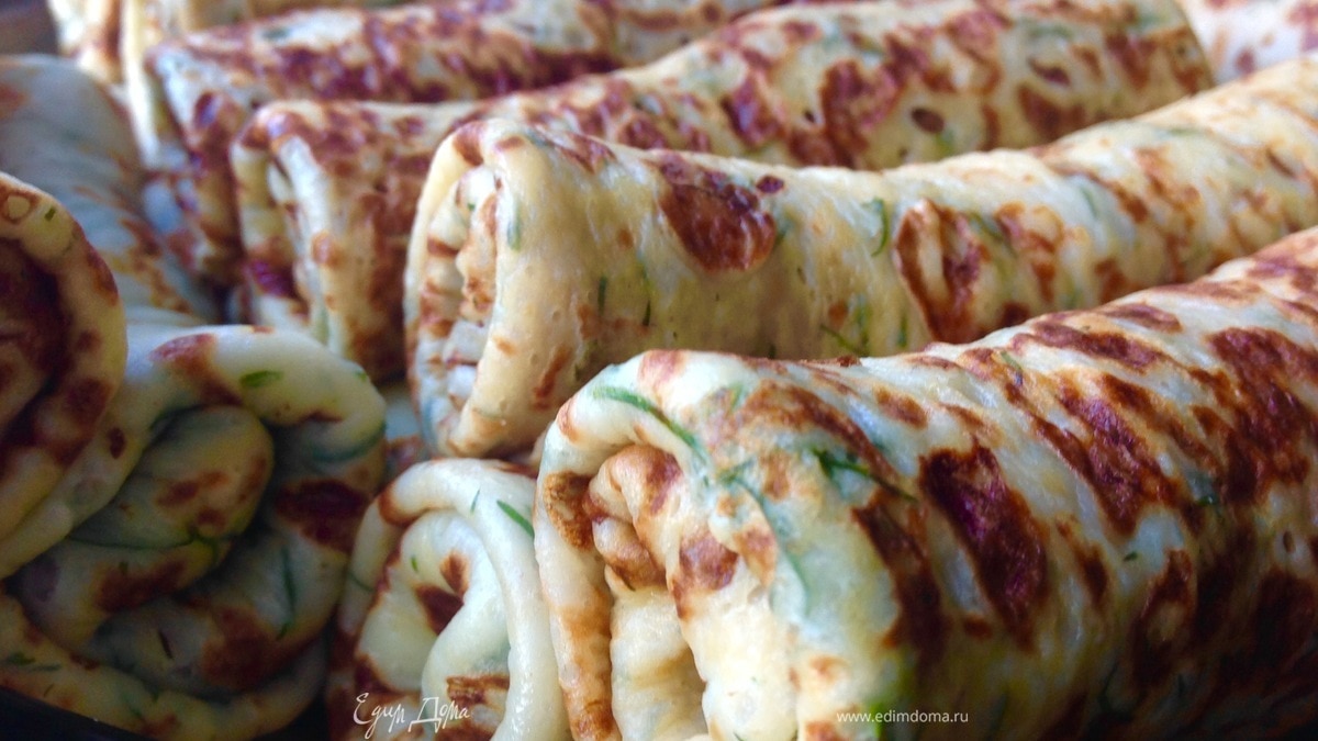 Это не тонкие блины, средней пышности, с творожным вкусом и зеленью.