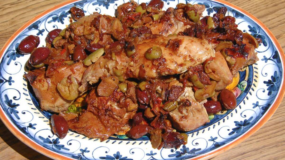 Кролик с красным луком и оливками