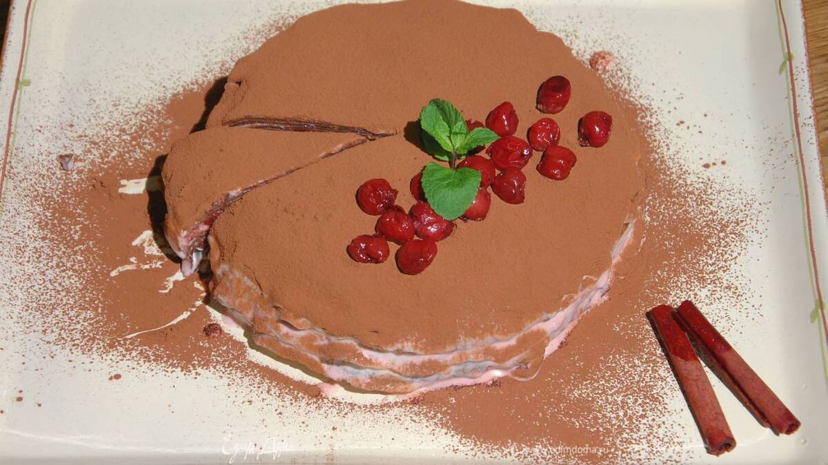 Готовый торт посыпать какао, украсить оставшейся вишней и веточкой мяты.