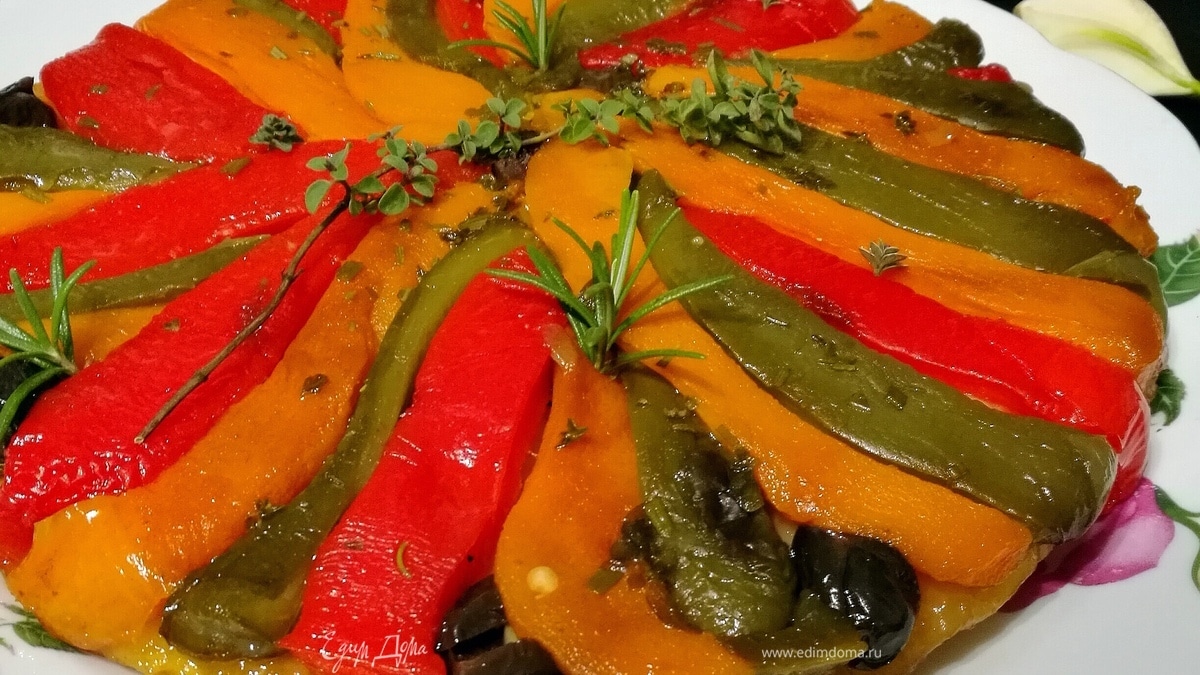 Перец болгарский запечь в духовке при температуре 200°С до черных подпалин, охладить немного и снять кожицу. Разрезать на полоски. Разъемную форму смазать оливковым маслом. Посыпать щепотками: розмарина, тимьяна и сахара. Выложить полоски перца. Выложить пластинки чеснока и кусочки маслин без косточки. Посолить и поперчить. - Шаг 3