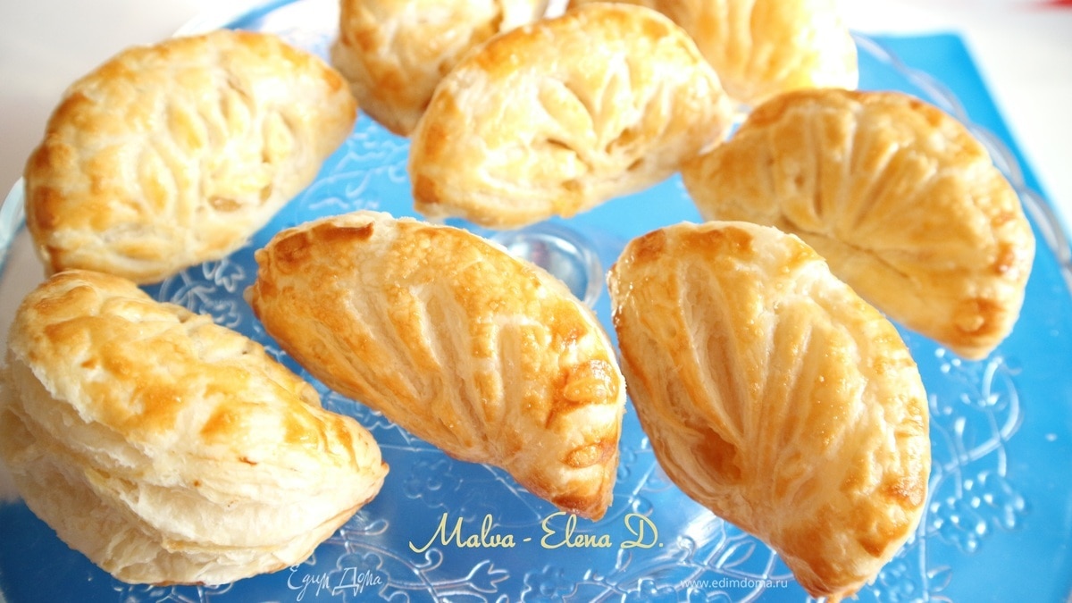 Вырезать кружочки из теста. На фотографии — кружочки из толстого слоя теста, которое предварительно не раскатывала. Формочка для шоссонов — очень удобно. Можно вырезать чашкой, верхняя часть которой диаметром 9 см. Край в этом случае можно пройти колесиком для пиццы, тогда он будет волнистым. - Шаг 11