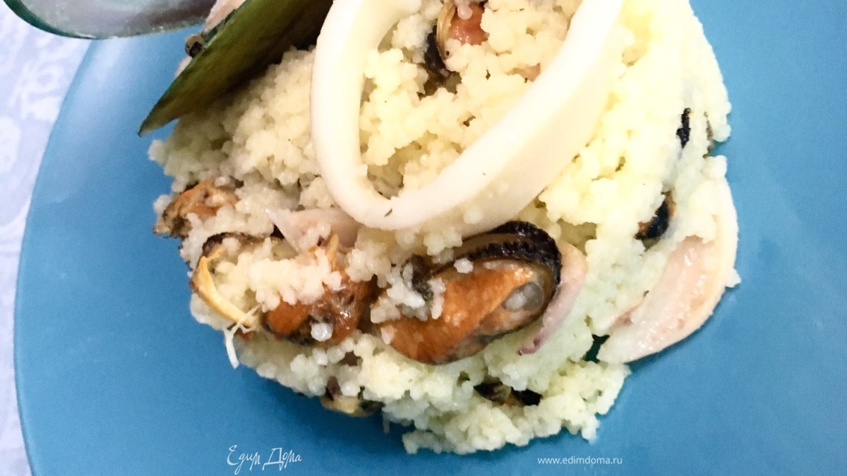 Добавить готовый кускус в сковороду. Посолить по вкусу, добавить щепотку прованских трав для легкого аромата и все хорошо перемешать. Готовить на среднем огне 3-4 минуты без зажаривания. Выложить в порционнные тарелки и украсить мидиями в ракушках. Приятного аппетита!