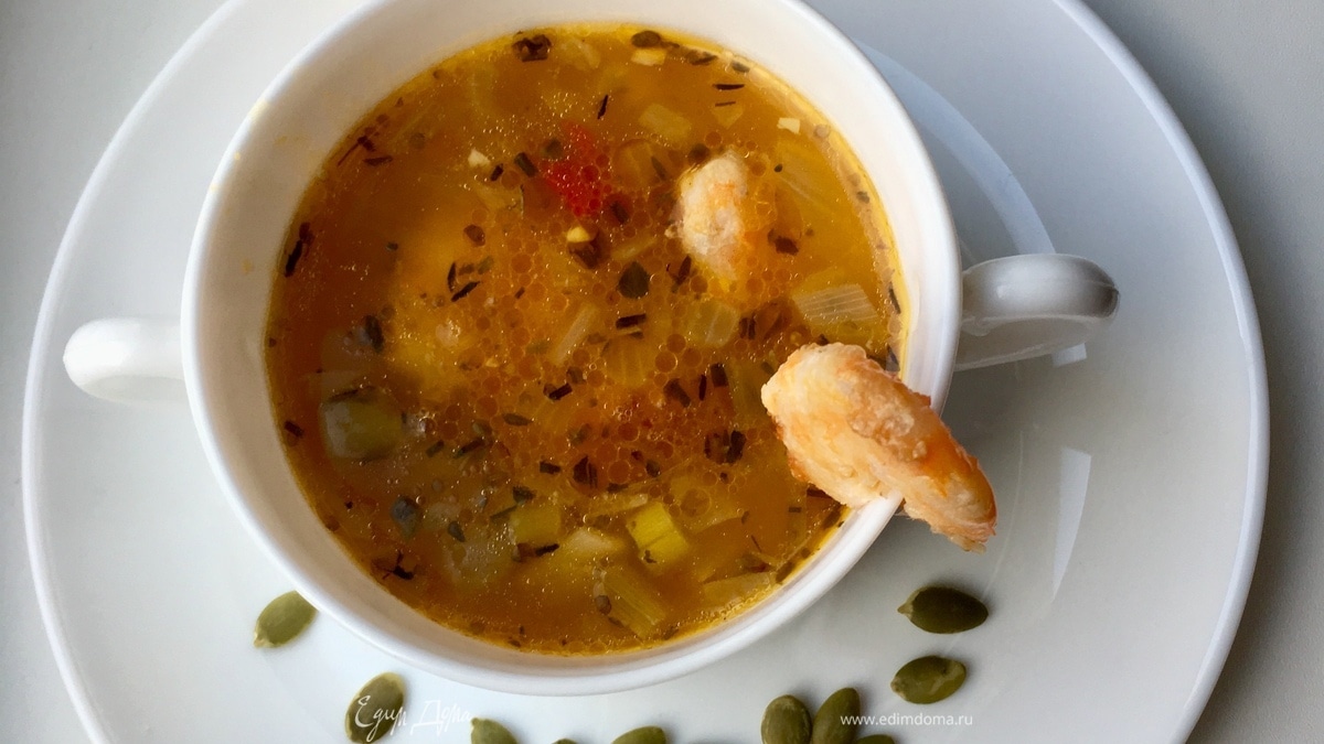 Ну, а подавать уже можно! Как только супчик закипит, все овощи «познакомятся» — суп готов! Скорее разливаем по супницам, в каждую кладем креветки, сколько душе угодно, и снимаем пробу со вкуснющего и легкого супчика! После него чувствуешь себя бодрым, сытым, но не переевшим, и полным сил для второй половины дня.