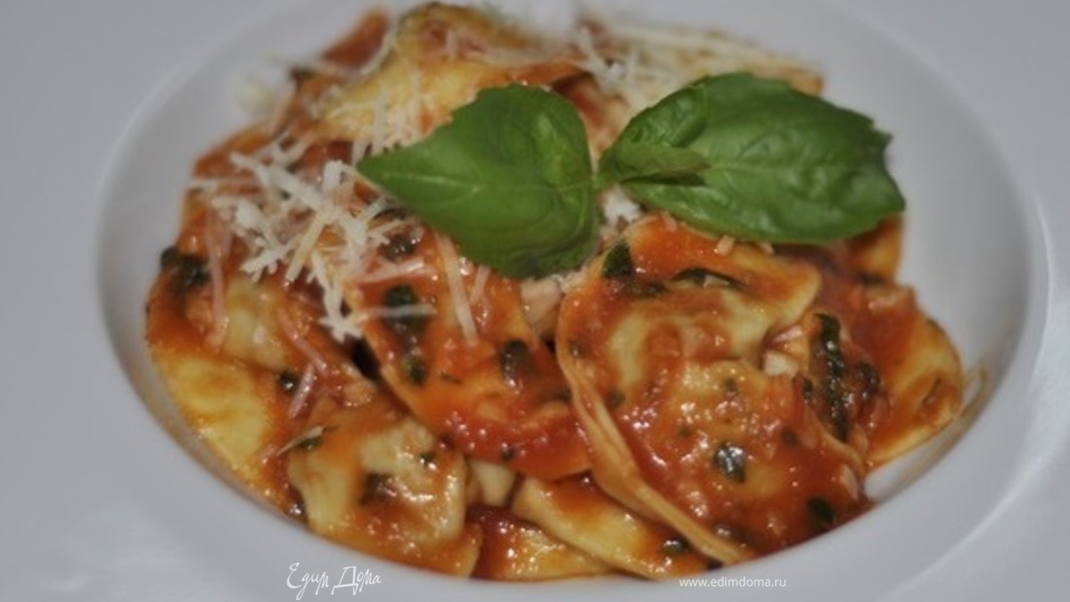 Каппеллетти варим одну минуту, так как начинка у нас уже готовая. Смешиваем с соусом. Выкладываем в тарелку, посыпаем пармезаном и украшаем базиликом.