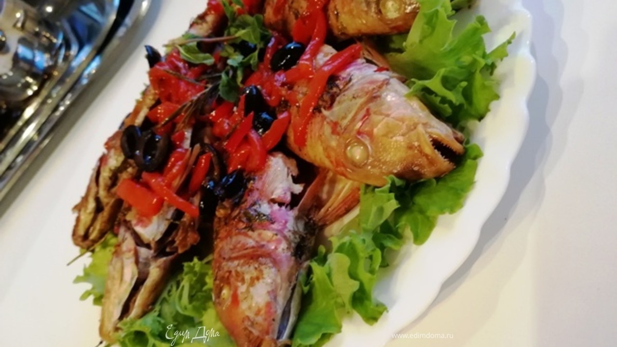 Выложите болгарский перец и маслины к барабульке. Каждую рыбу смажьте маринадом и оставьте на 10 минут. Затем поставьте противень в разогретую до 180°С духовку. - Шаг 6