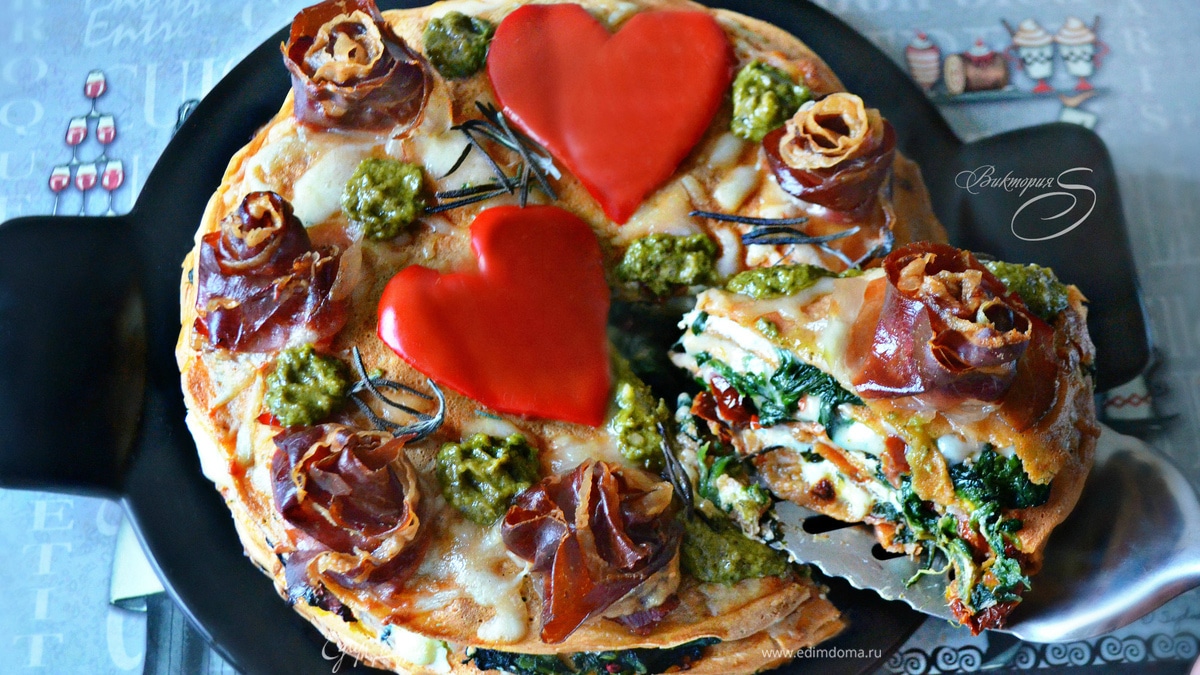 Повторить так с каждым блинчиком. Последний слегка посыпать моцареллой, украсить «розочками» из прошутто и веточками розмарина, поставить в разогретую до 180°С духовку на 20–30 мин.