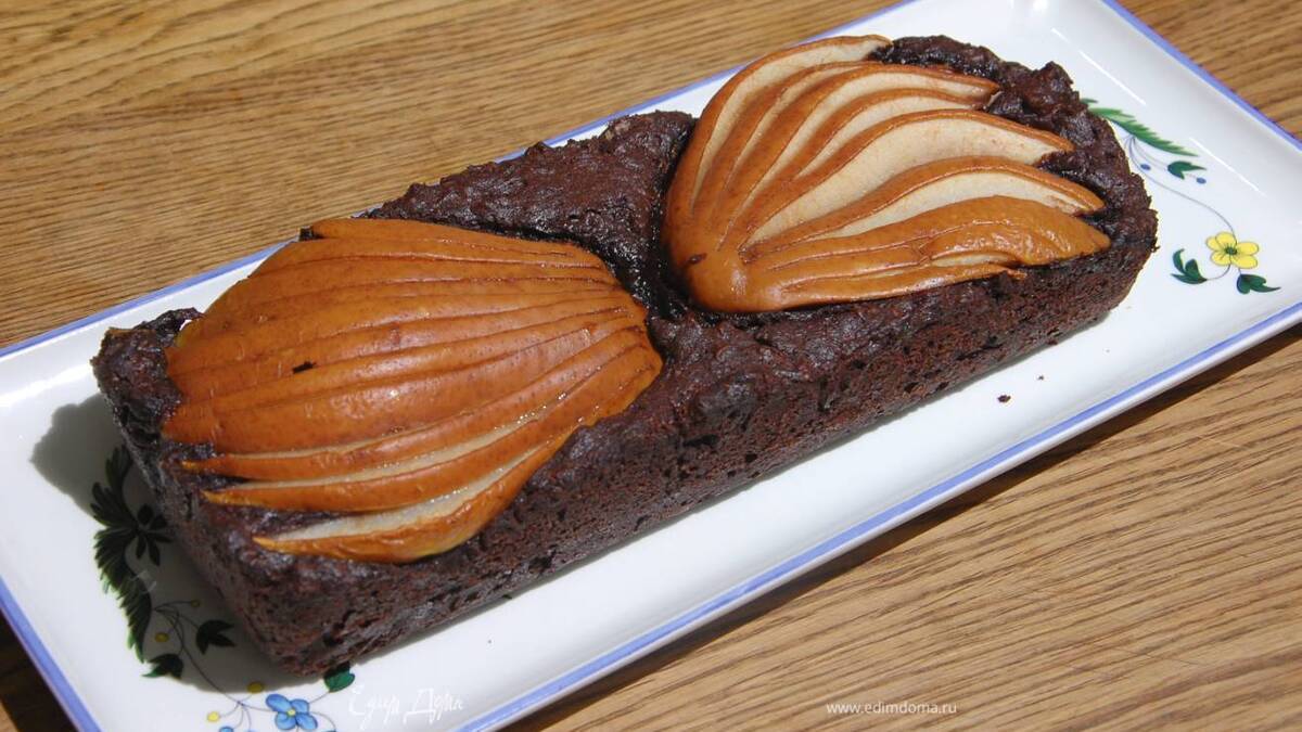 Грушу разрезать вдоль пополам и, удалив сердцевину, нарезать тонкими дольками, оставив один край целым, и выложить обе половины на тесто веером, слегка утопив их. - Шаг 7