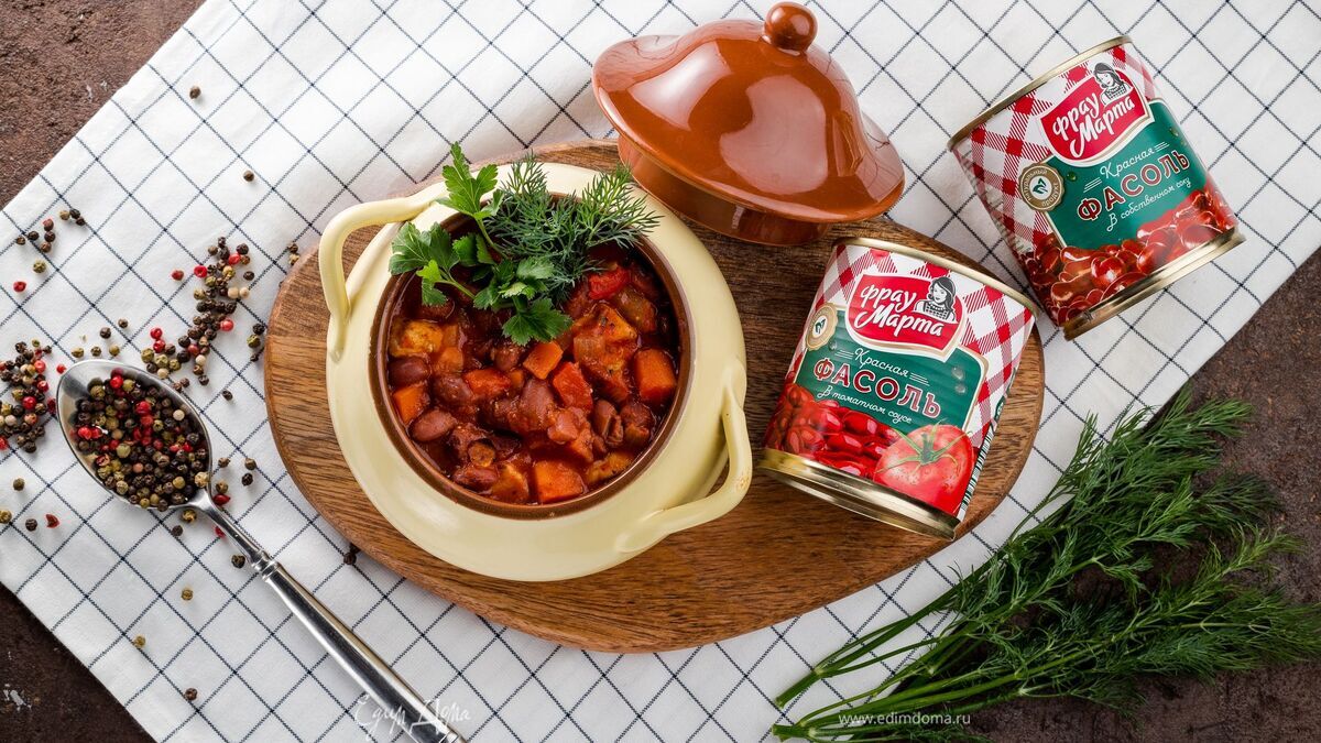 Добавьте красную фасоль в томатном соусе ТМ «Фрау Марта» и красную фасоль в собственном соку ТМ «Фрау Марта», доведите блюдо до кипения и тушите еще 3 минуты. Добавьте специи по вкусу. - Шаг 6