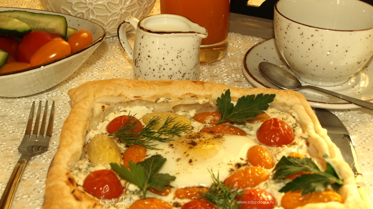 Выкладываем начинку из брынзы. Выкладываем помидоры по кругу. Оставляем пространство в центре для куриного яйца. Отправляем в заранее разогретую духовку до 180°С и выпекаем 20-25 минут (ориентироваться на свою духовку). Через 20-25 минут достаем пирог.
