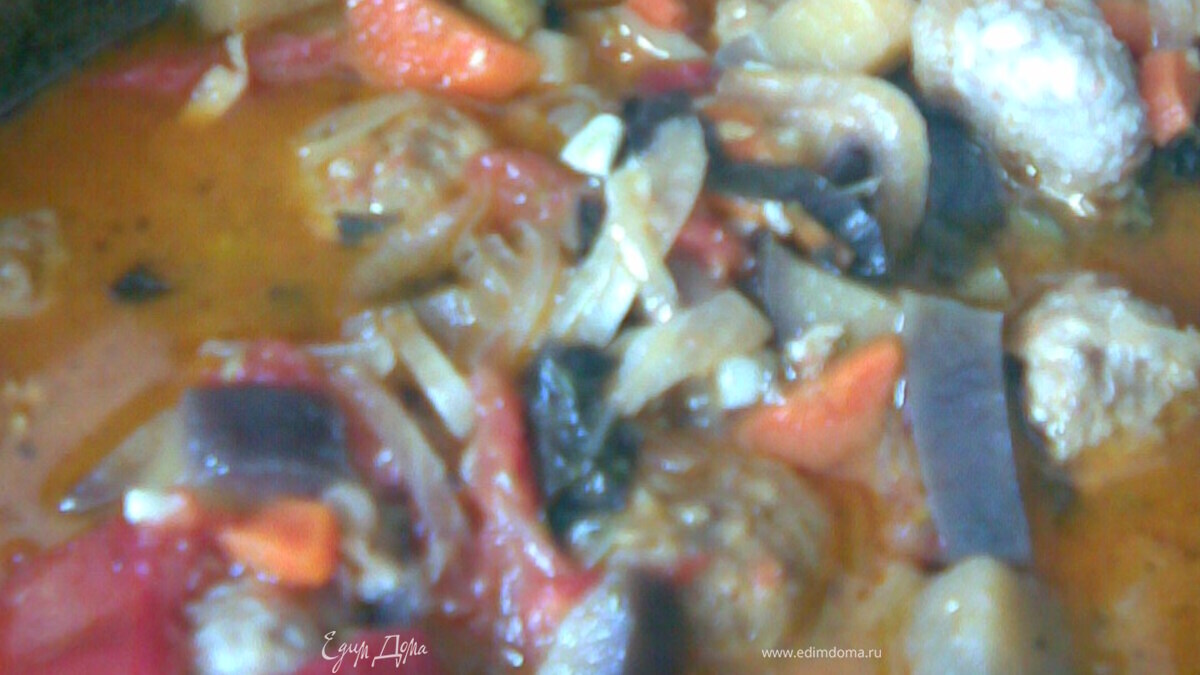 - ПодготовкаОбжариваем лук,морковь до золотистого цвета.Баклажаны порезать кубиками и обжарить отдельно,затем соединить с зажаркой.Помидоры ошпарить очистить от кожицы,порезать кубиками и добавить в общий набор овощей.Потушить мин 20 под крышкой.Фрикадельки лучше добавлять замороженными,чтоб они не развалились.Потушить ещё 20мин,добавить зелень,чеснок,специи,перемешать аккуратно.
