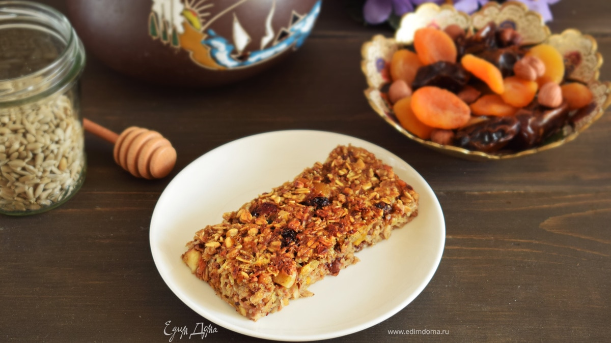 Полезные и питательные батончики из орехов и сухофруктов. Можно брать с собой в качестве перекуса. Здесь огромный простор для фантазии — можно брать любые любимые орехи, сухофрукты и семечки. Я взяла миндаль, фундук, курагу, вяленую клюкву, семена подсолнечника, чиа и льна.