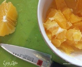 Почистите апельсины и нарежьте их небольшими кусочками, сок сохраните.