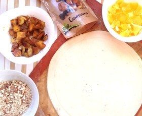 Раскатать тесто в виде круга. Поочередно выложить начинку.