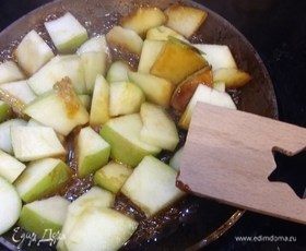 Яблоки также очистить, порезать. На скороводе растопить сахар и выложить яблоки. Очистить от кожуры семена кардамона и растолочь, посыпать яблоки. Готовить 7 минут.