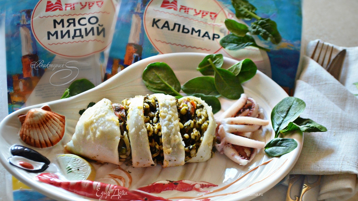 Кальмары, фаршированные булгуром и мидиями