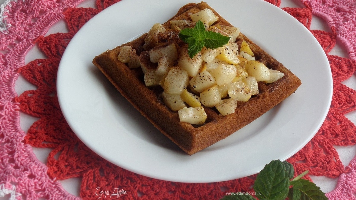 На тарелку кладем испеченную вафлю. На вафлю выкладываем 1-2 ст. л. приготовленных груш. Поливаем вафли медом и посыпаем корицей.