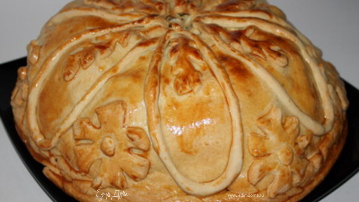 От оставшегося теста отделяем небольшой кусок на украшения, остальное раскатываем в большую лепешку и накрываем начинку будущего пирога. Посередине делаем отверстие для выхода пара. Украшаем на свой вкус остатками теста, смазываем желтком и отправляем в разогретую до 180 градусов духовку на полтора часа.